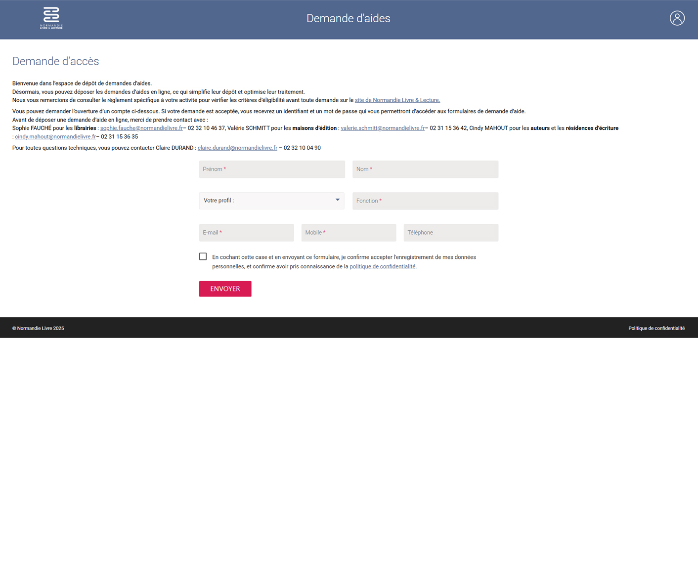Plateforme de dépôt des demandes d’aides pour les éditeurs, les libraires et les auteurs. Fonds d’aides au développement de l’économie du livre en Normandie. Réalisé